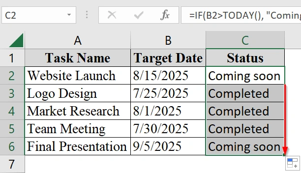 This formula checks if the date in cell B2 is later than today’s date. If it is, the result is “Coming soon“. Otherwise, it is “Completed“.