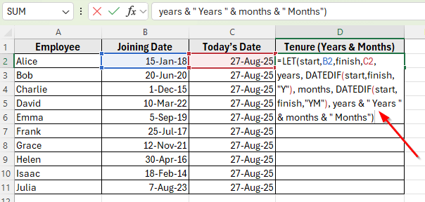 In HR, payroll, and employee records, you often need to calculate employee tenure based on their joining date and today’s date. Tenure tells you how long someone has worked, expressed in years and months.