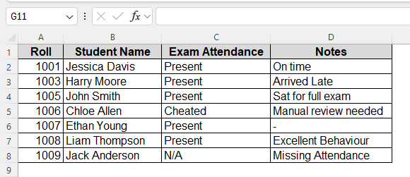 We’ll use a simple exam attendance dataset to show each method in action. You’ll see how to clean up entries without harming the rest of the sheet. It is more helpful if you are new to using Excel.