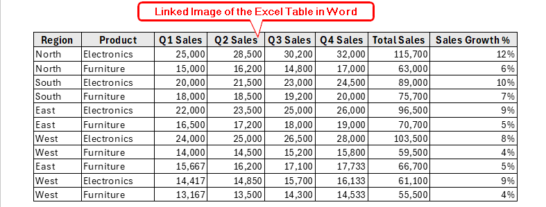 In the following dataset, we have a Quarterly Sales Performance Report that spans multiple columns and rows. The table contains data for different regions, product categories, and quarterly revenue. Because this table is wide, it’s an ideal example for demonstrating how to place a large Excel table into Word without losing formatting.