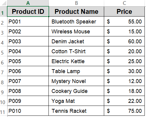 We’ll use the VLOOKUP function to find information like Product Name and Price just by typing the relevant Product ID in another sheet.