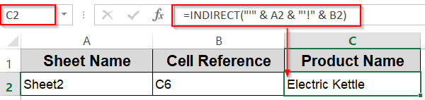 For example, you could type Sheet2 in one cell and C6 in another, and the formula will instantly return Electric Kettle from your dataset. Change the sheet name to point to another source, or adjust the cell reference to fetch a different product detail such as the price, and the results update automatically.