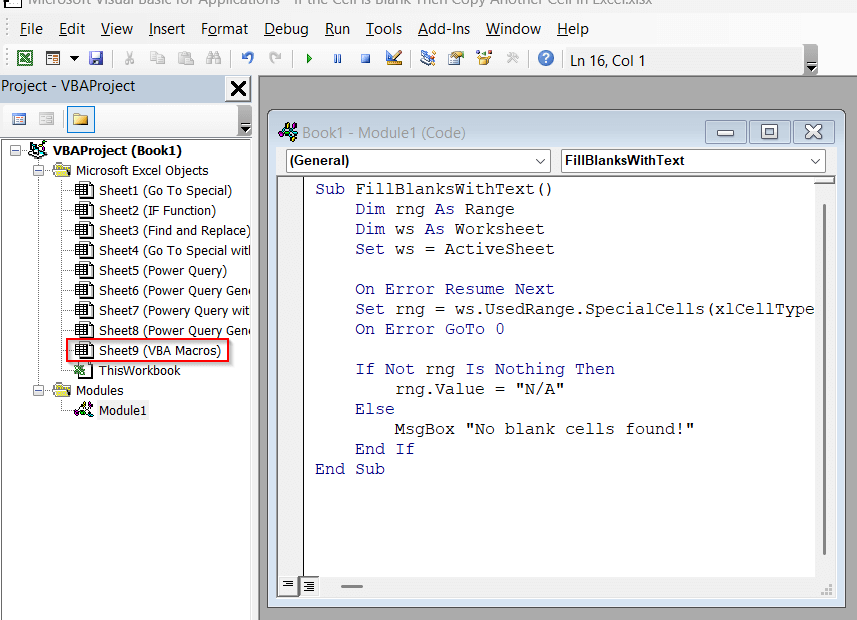 Another alternative for large and repeated data is to use VBA Macros. In times when other methods seem too monotonous or repetitive, you can save a lot of time by using a simple and short VBA script to replace all the blank cells in Excel