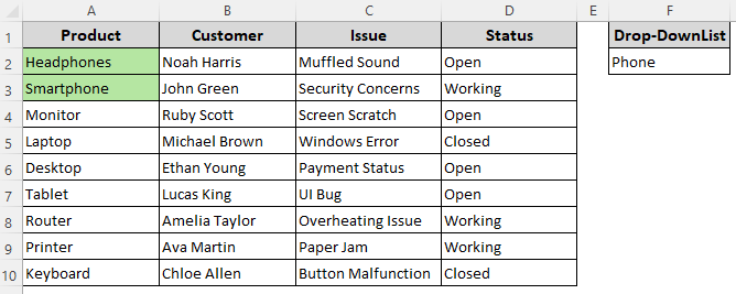 Our sample dataset for customer issues has columns for Product, Customer names, Issue description, and Status. In Column F, we have a list of 5 products based on which we’ll apply the highlighting rules.