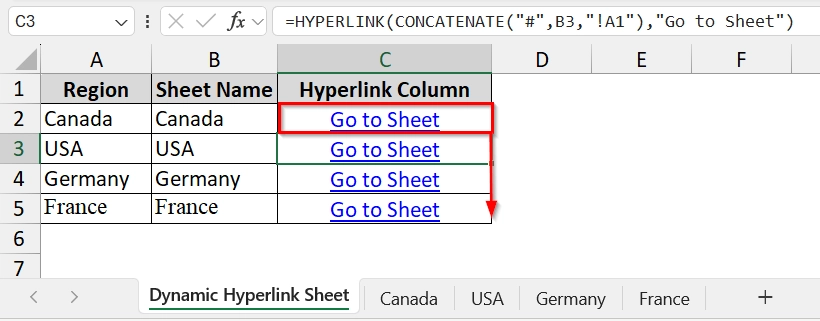 ➤ Then drag down from cell C2 using the fill handle and get all the hyperlinks for the remaining cells. Now you can click on any dynamic hyperlink to go to the desired sheet.