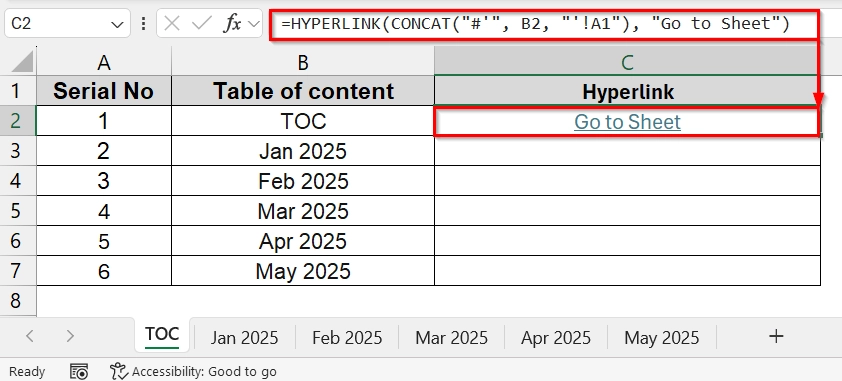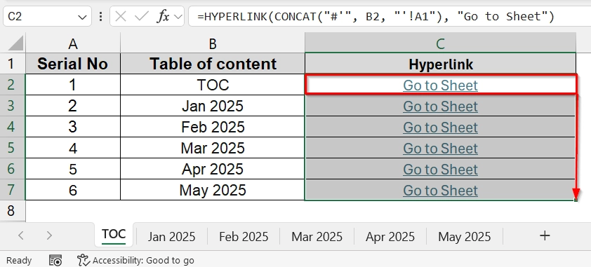 ➤ Drag this formula down for all rows. Now you can click “Go to Sheet” to navigate any worksheet.