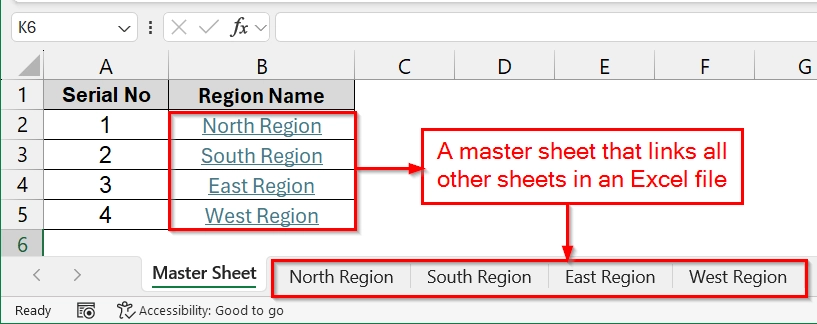 In this example, we will create a Master Sheet that acts as a navigation hub. Instead of scrolling through dozens of sheets, you can click the hyperlinks in the Master Sheet to instantly jump to each region’s data sheet.
