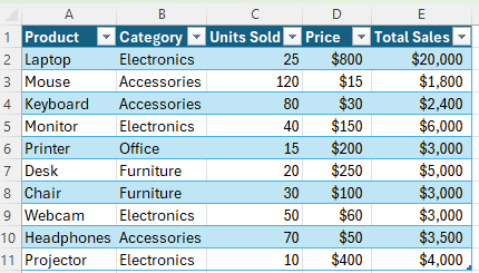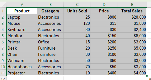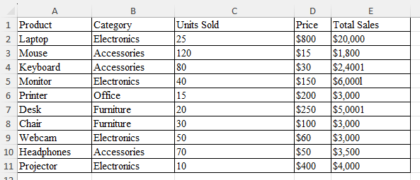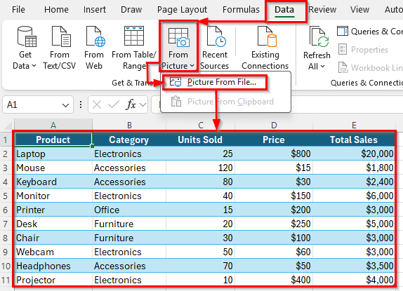 In the following example, we’ll work with a sales dataset extracted from an image. This image has 5 columns labeled as Product Name, Category, Units Sold, Price per unit, and Total Sales.