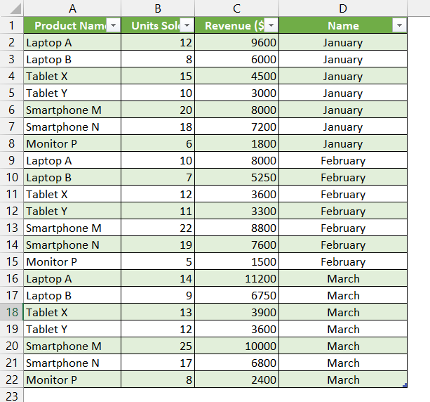We have a dataset of UrbanTech Electronics that tracks monthly sales in separate worksheets for each month. To analyze quarterly performance efficiently, we will combine all three monthly sheets into a single table using Power Query in Excel.