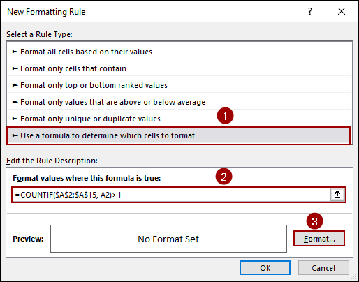 This is a variation of the previous method, but it gives you a more descriptive result in your helper column. Here, we will use the combination of IF and COUNTIF functions to understand which rows are duplicates.