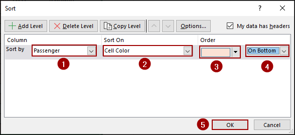 Sort by: Select the column you applied conditional formatting to (“Passenger”).