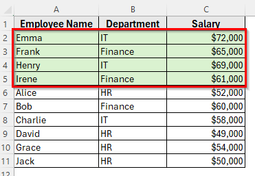 ➤ Now your dataset will display all Finance employees first, followed by HR employees, and then IT employees, regardless of alphabetical order.