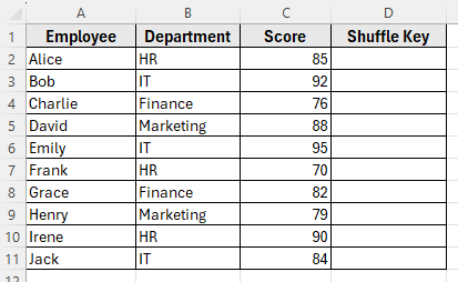 We’ll use this dataset to demonstrate how to shuffle rows randomly in Excel. Our goal is to randomly sort the employees so the order changes each time we apply a method.