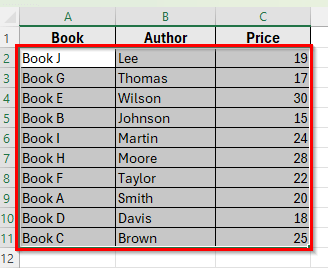 In this following dataset, here’s a list of books with their authors and prices. It contains three columns: Book in Column A, Author in Column B, and Price in Column C.