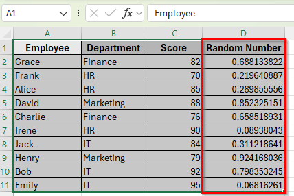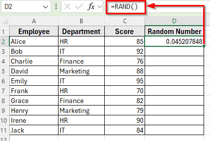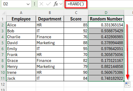 ➤ Drag the fill handle down from D2 to D11 to fill random numbers for all employees.