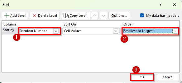 ➤ A Sort dialog box will appear. Now select Shuffle Key as the column to Sort by. Select Smallest to Largest or Largest to Smallest in the Order box.
