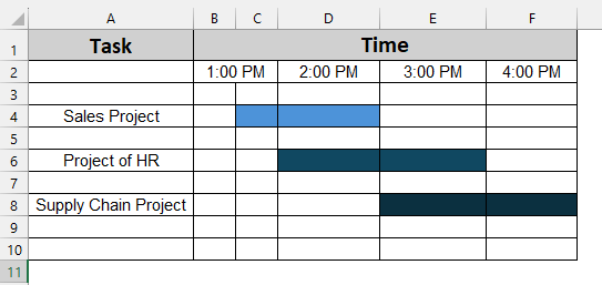 The dataset below indicates that every group project requires approximately 2 hours to complete. Although the time is merging, the Sales Project starts after 30 minutes. Here, one cell represents 1 hr. Now, we will split this one cell into two, colour-wise, so that it can be divided into two 30-minute intervals.