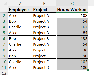 Let’s take the following data, which has the total work done by each employee recorded in days.