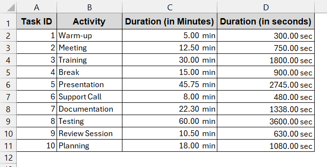 The following dataset has only the time duration in minutes. For a clear understanding, you will convert them to seconds.