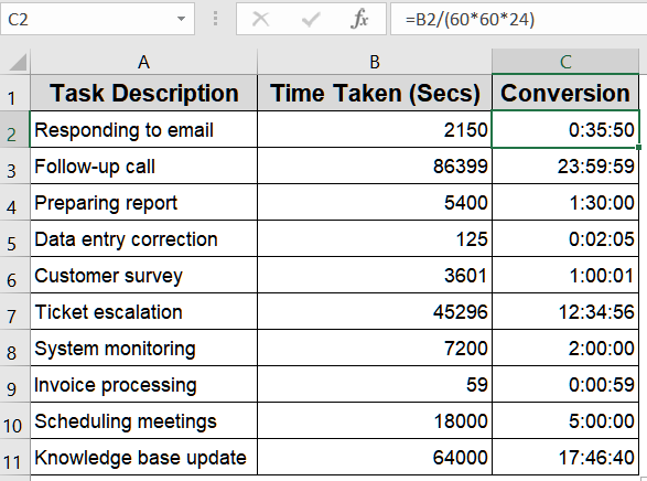 Working with time data stored in seconds can be confusing. For example, customer service call durations or equipment run times are often logged as raw seconds which aren’t very readable for reporting or analysis. Converting these values into the h:mm:ss format makes your spreadsheets much easier to interpret.