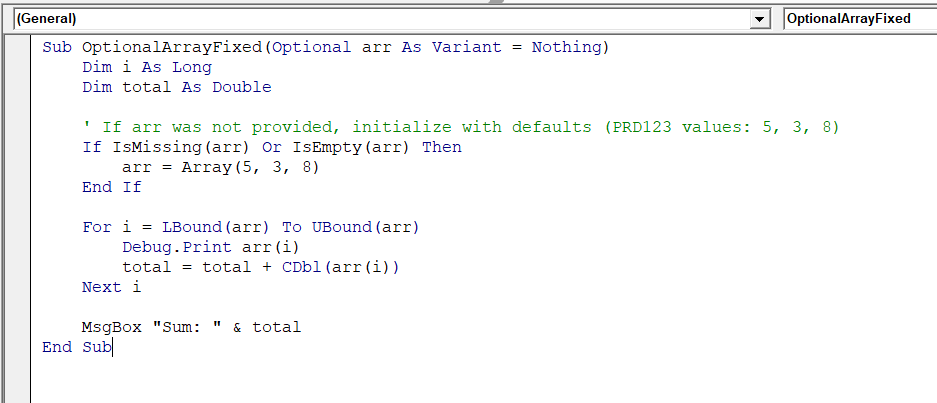 Sub OptionalArrayError(Optional arr As Variant = defaultVals)