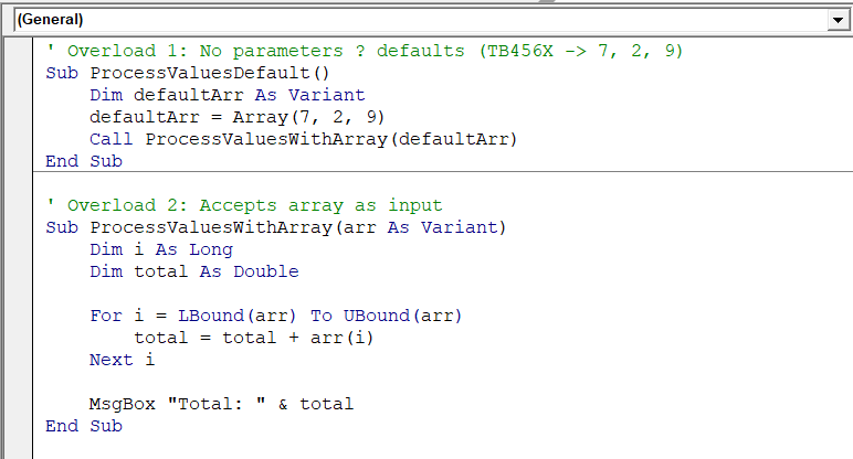 ParamArray allows you to pass a variable number of arguments as an array. This method works perfectly when you want to process multiple values.