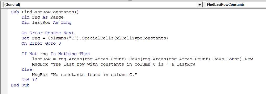MsgBox "The last row with constants in column C is " & lastRow