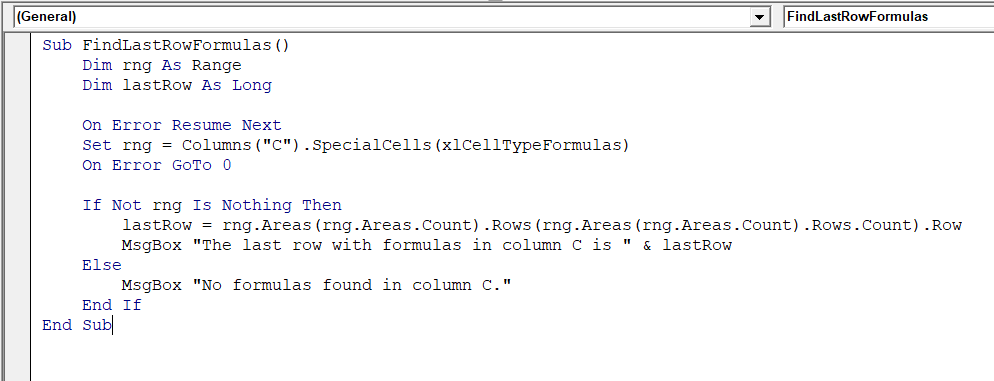 MsgBox "The last row with formulas in column C is " & lastRow