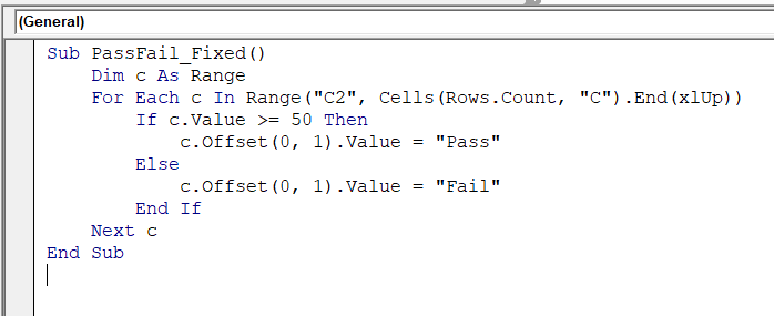 If c.Value >= 50 Then c.Offset(0, 1).Value = "Pass" Else c.Offset(0, 1).Value = "Fail"