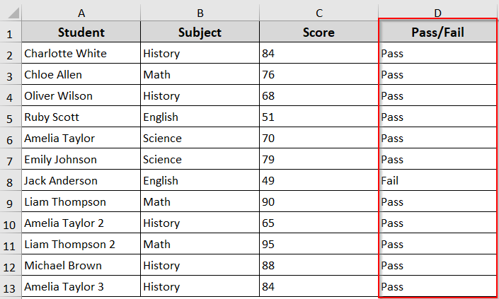 ➤ Now the code works properly, displaying Pass or Fail based on the scores of the students.