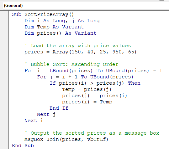 In this method, we’ll load a 1D array of prices, sort it in ascending order using Bubble Sort, and display the sorted values in a message box.