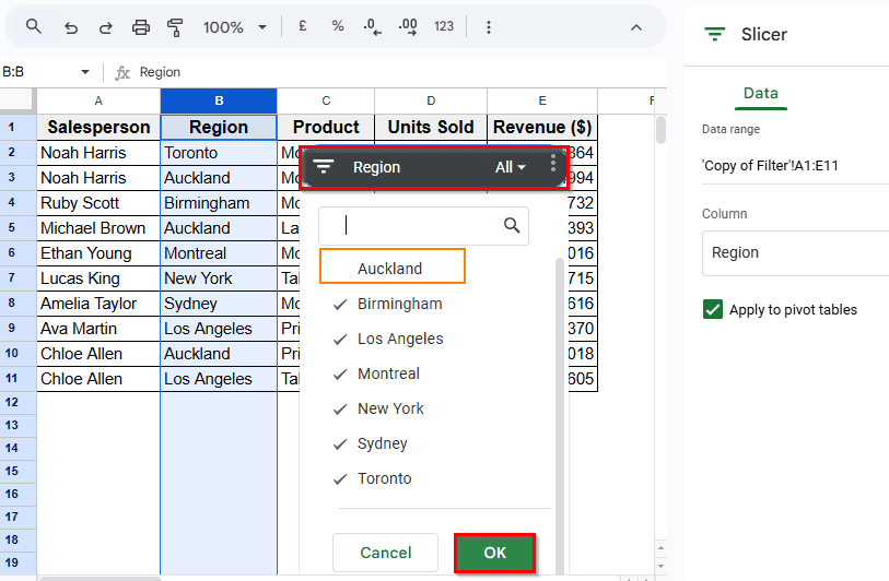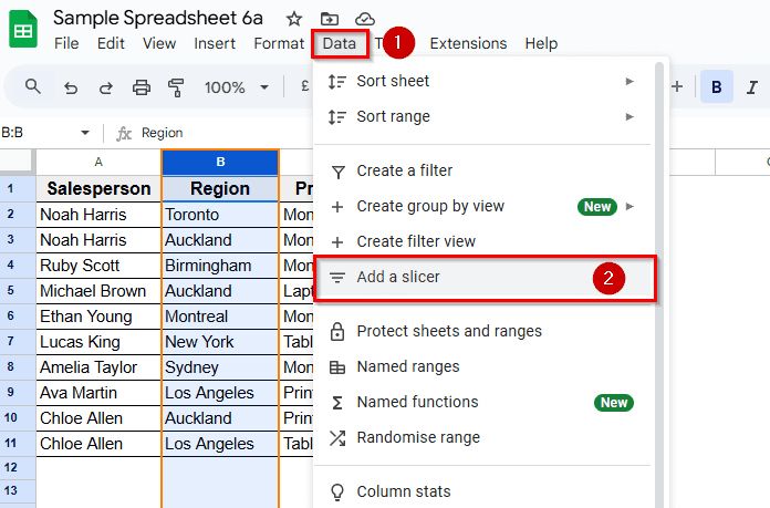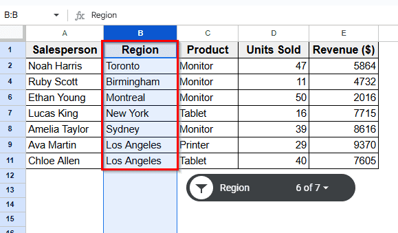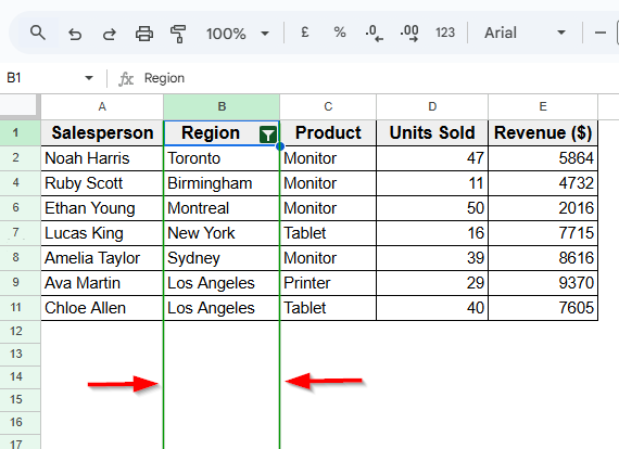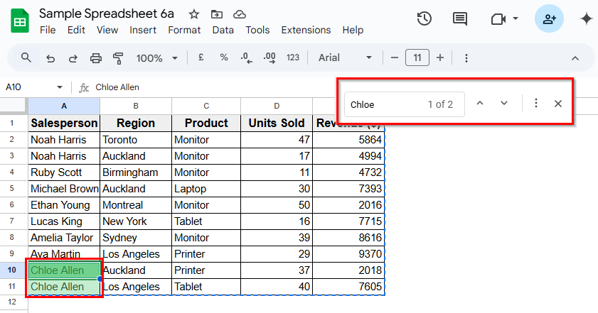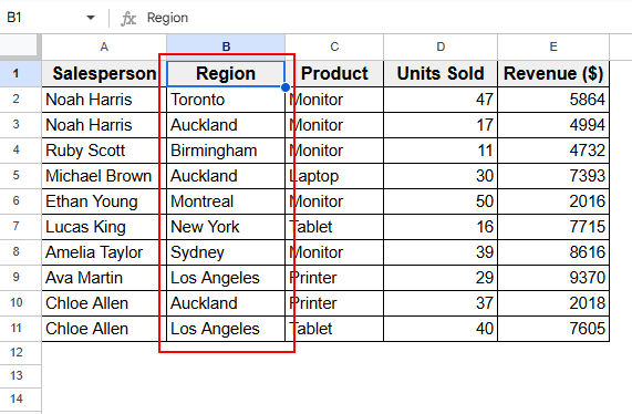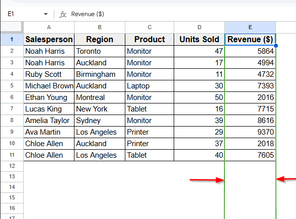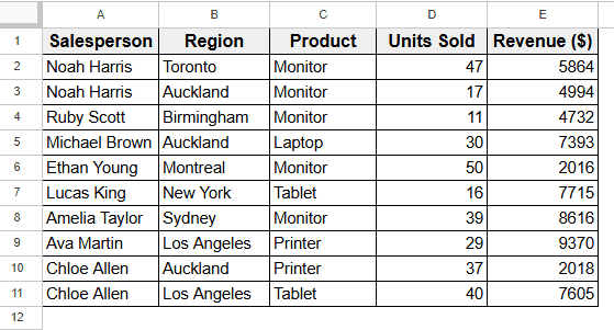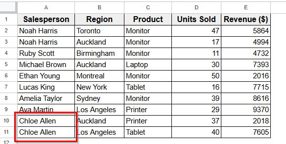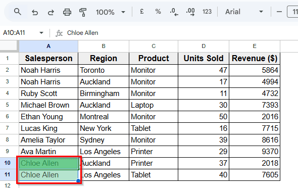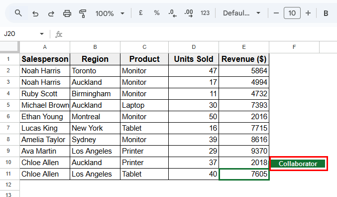 We used a sample dataset regarding the sales tracking of a few salespeople. Let’s find out plausible reasons and easy ways to remove the green border using this sample sheet.