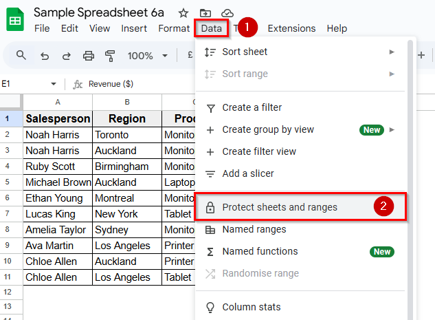 ➤ Go to Data > choose Protect sheets and ranges to check if the column is protected.