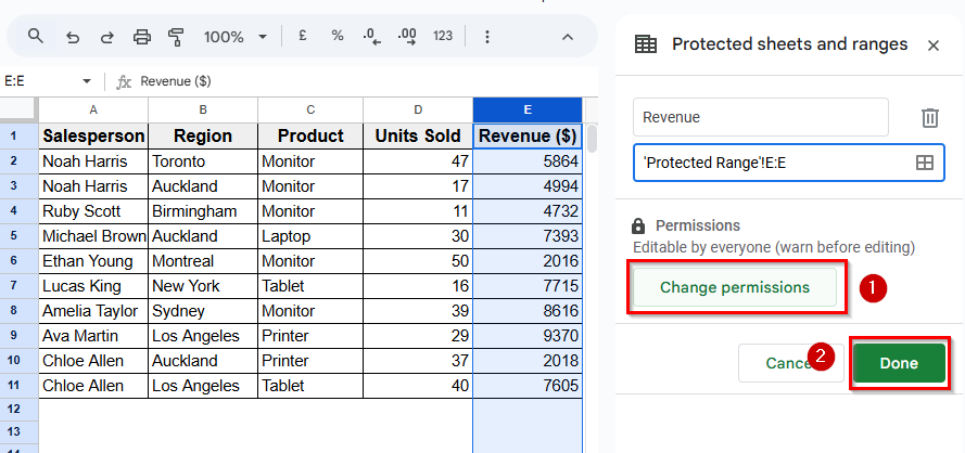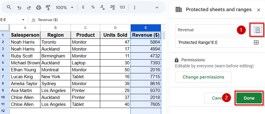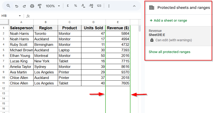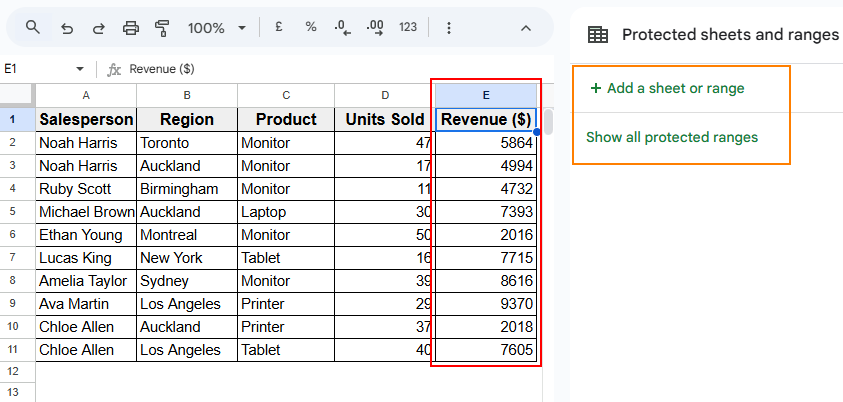 ➤ A sidebar named “Protected sheets and range” will appear, and Column E shows that it is protected here.