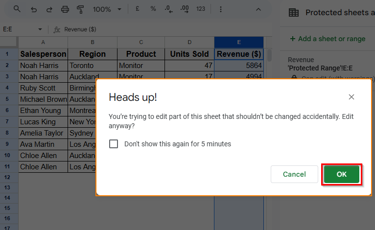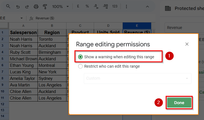 ➤ Then “Range editing Permissions” > select ‘Show a warning when editing this range’.