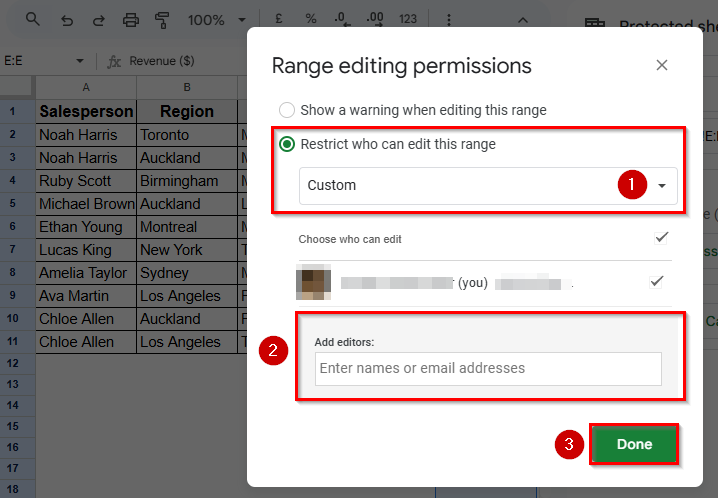 ➤ Select ‘Restrict who can edit this range’ and add editors to allow them to edit.