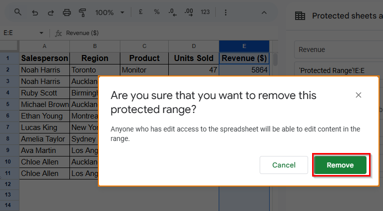 ➤ A pop-up will appear. Click “remove” to delete the protected range.