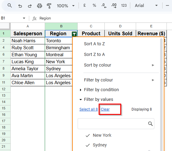 ➤ Click Filter Icon > Clear filter options to remove the filter.