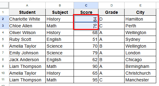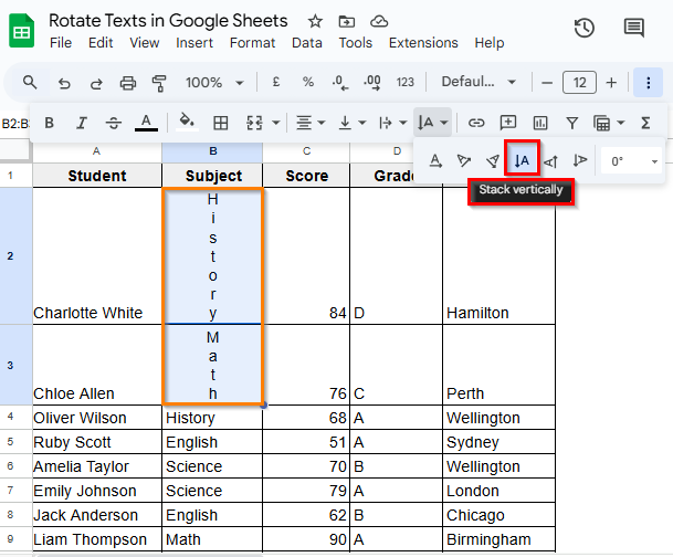 Here’s a sample dataset regarding students’ grades in different subjects. You can rotate any desired text to present the sheet more cleanly and compactly. For that, we’ll simply use the Rotate Text built-in tool from the Toolbar to rotate texts as needed.