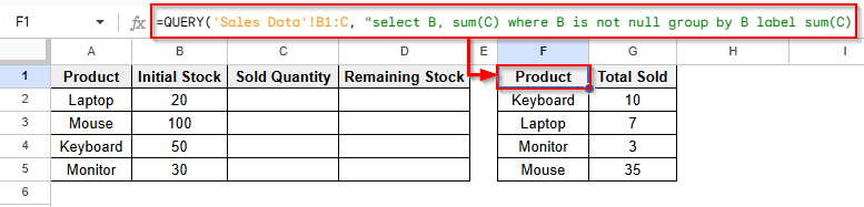 In this method, we will use the QUERY & VLOOKUP functions to link two sheets. The QUERY function will create a sales data summary table. Then, using the VLOOKUP function, we can find the sold quantity and remaining stock data.