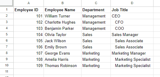 Suppose, we want to increase the indent of the selected job titles so we can easily understand these roles are the subordinates of the CEO, Sales Manager and Marketing Manager. To change the indent of the text, we have to follow the instructions below: