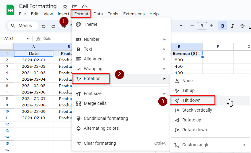 Rotating text in Google Sheets means changing the orientation of text within a cell. This allows you to display the text vertically or at an angle, rather than horizontally. Rotating text can be useful for fitting long labels into narrow columns or creating headers that span multiple lines. To rotate the text in Google Sheets, let’s follow the steps below: