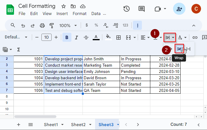 Wrapping text in Google Sheets means allowing text to automatically move to the next line within a cell if it exceeds the cell’s width. This feature ensures that all the text remains visible within the cell without being cut off. It’s helpful for displaying lengthy text entries or long sentences without enlarging the cell width, making your data more readable and organized.